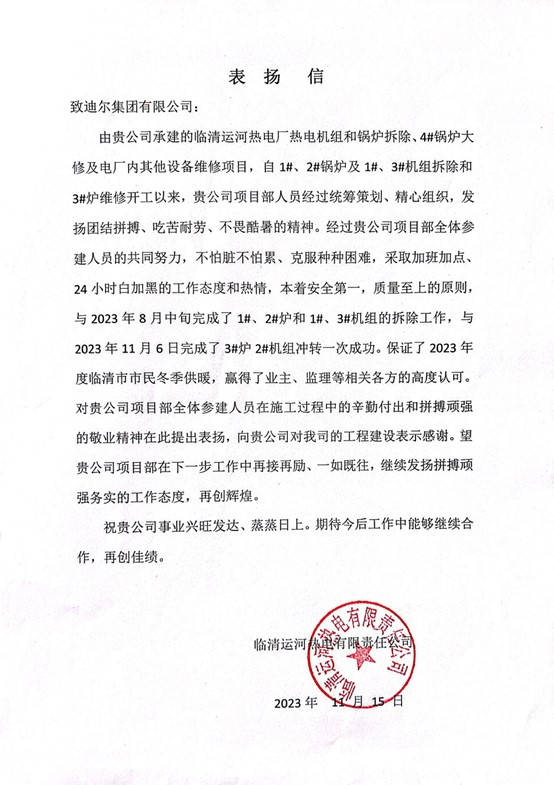 臨清運河熱電2#機組沖轉(zhuǎn)一次成功表揚信