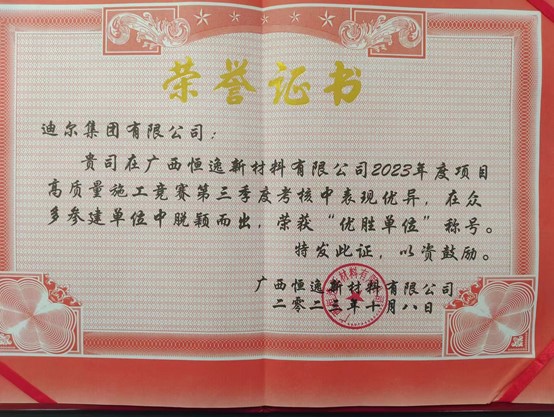 由迪爾集團(tuán)有限公司第二公司承建的廣西恒逸項(xiàng)目部,在2023年度項(xiàng)目高質(zhì)量施工競賽中表現(xiàn)優(yōu)異,榮獲“優(yōu)勝單位”稱號,受到了監(jiān)理單位、建設(shè)單位的一致好評!